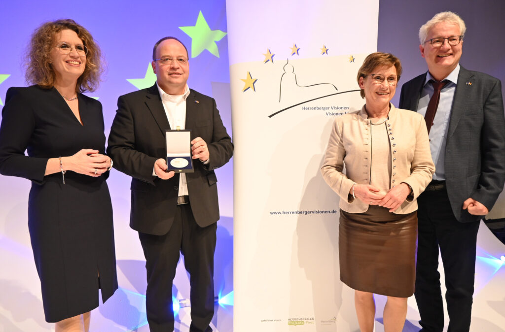 Meinhard Ober und Steffen Straube-Kögler wurden am 7. November 2025 von der Europaabgeordneten Prof. Andrea Wechsler mit der Europamedaille der EVP-Fraktion des Europäischen Parlaments ausgezeichnet. Die beiden Initiatoren der Herrenberger Visionen setzen sich seit 2018 dafür ein, die Vorzüge des Europäischen Gedankens in Herrenberg sichtbar und hörbar zu machen. In ihrer Laudatio begründete Staatssekretärin Sabine Kurtz MdL die Verleihung der Medaille mit folgenden Worten: „Diese Ehrung würdigt Ihr herausragendes Engagement für den europäischen Gedanken, Ihren unermüdlichen Einsatz für den Dialog und Ihre gelebte Vision einer gemeinsamen Zukunft. Denn Sie leben vor, was Europa im Kern ausmacht: Engagement, Dialog und die Vision einer gemeinsamen Zukunft.“ Die Ehrung fand in Ludwigsburg statt – unweit des Schlosses, wo Charles de Gaulle im Jahr 1962 seine berühmte „Rede an die deutsche Jugend“ vor über 10.000 Jugendlichen hielt.